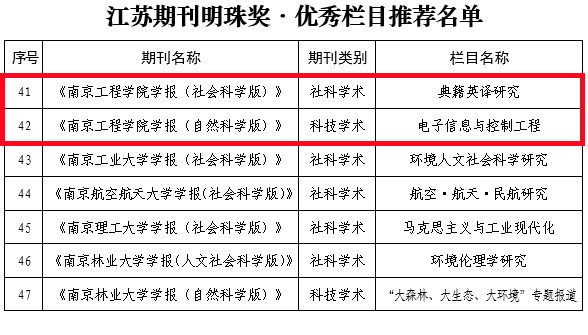 近日,江苏省期刊协会发布《关于江苏期刊明珠奖·优秀栏目推荐结果的通报》《关于江苏入选第七届华东地区期刊“优秀栏目”推荐活动的通报》,304am永利集团学报(社会科学版)“典籍英译研究”、304am永利集团学报(自然科学版)“电子信息与控制工程”2个栏目被评为江苏期刊明珠奖·优秀栏目;其中“典籍英译研究”栏目被推荐参评华东地区期刊“优秀栏目”并成功入选。江苏期刊明珠奖是由江苏省期刊协会组织评选的重要期刊奖项,旨...