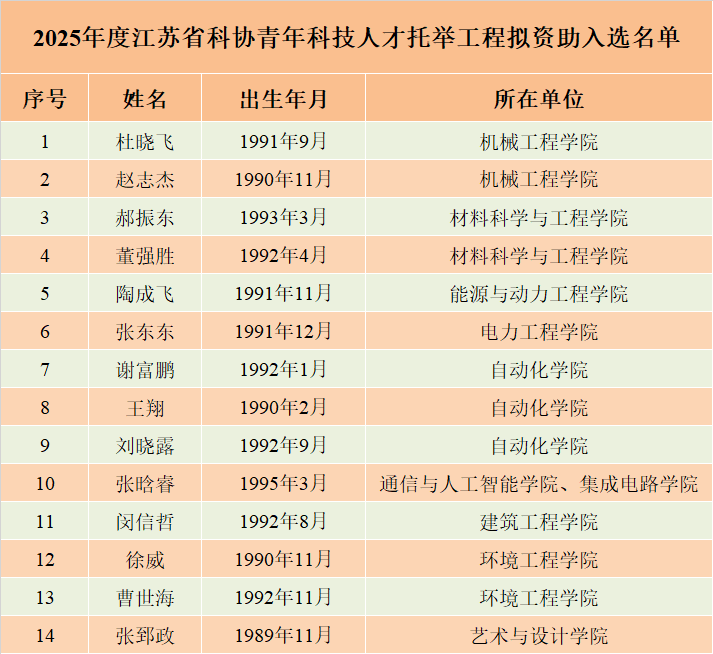 近日,江苏省科协公布2025年“青年科技人才托举工程”资助对象名单,永利官网14名青年教师入选。江苏省“青年科技人才托举工程”是由江苏省科学技术协会组织实施的人才项目,培养时间为2年。项目旨在支持青年科技人才在创造力“黄金期”潜心研究、深入探索,尽快成长为高层次科技创新人才的储备力量。永利官网高度重视青年科技工作者的成长,近年来,持续加大投入,强化学科平台建设,打造高水平科研团队,促进跨学科交流与合作,为青年...