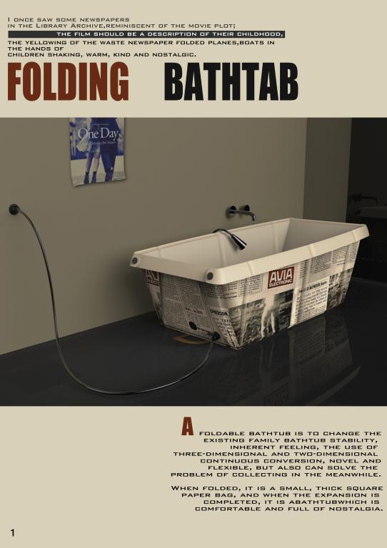 据设计者介绍,“折叠式浴缸”的设计源于折纸带来的启发。在他们的设计中,用新型材料制作的浴缸能够折叠、方便拆装,可令家中获得更多的生活空间。使用时,只需通过简单的安装即可享受沐浴带来的放松;折叠后,其小巧的形态也可方便于收纳。设计者还通过外观设计赋予这款浴缸复古的风格,给现代的家居增添一丝韵味。折叠浴缸以其创新的设计思路赢得了评委的青睐。
