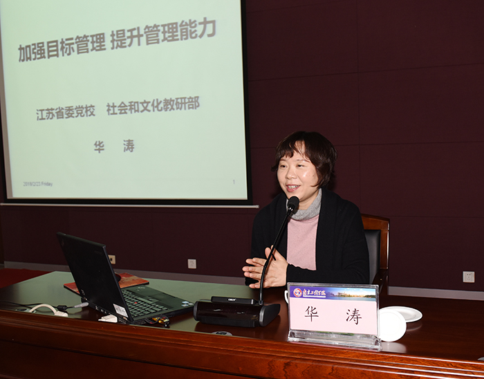本次培训分两个单元进行。2月23日下午,江苏省委党校社会和文化教研部主任华涛教授以“加强目标管理,提升管理能力”为题作了首场报告。华教授的报告从“何为目标管理”引入,结合实例和个人工作经历与体会,对管理发展存在的问题、组织目标实现的要素以及管理能力提升的关键等内容做了分析与讲解,为大家上了一堂内容丰富并且接地气的管理学课程,也引发了干部们对如何通过目标管理实现有效管理的深入思考。