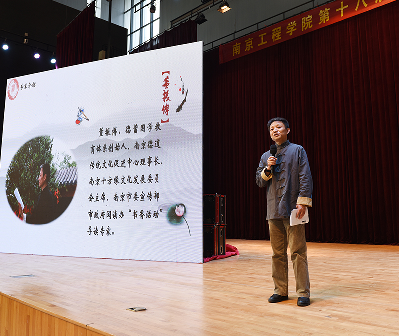 德蓄国学教育体系创始人,南京市委宣传部市政府阅读办“书香活动”导读专家董振博先生对此次诵读活动进行点评。董振博先生称此次诗朗诵带给他最多的是“感动”,仿佛穿越到两千多年前,与古人同乐。中华文明千年不断,得益于古人仰观天,俯察地,文化源于天地,取法自然,拥有强大的生命力。而今,我们需立本、筑魂、打底色,防止文化漂移。优秀传统文化进校园,则为立本。董振博先生还为在场师生现场解读的八部经典,他指出,在中华民族伟大复兴的时代背景下,学习和融入华夏文化,正是当代大学生所应当追求的。