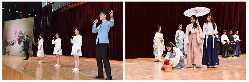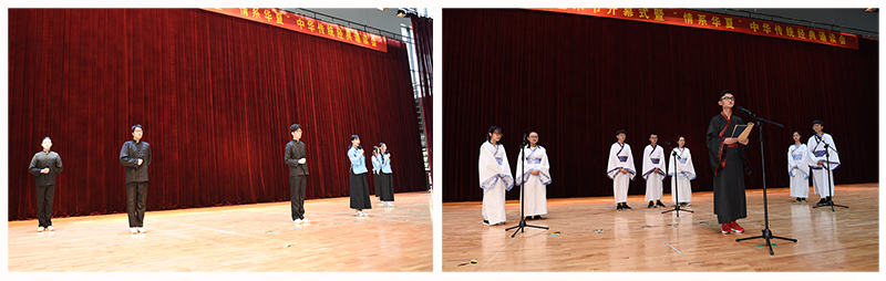 中华传统经典诵读会中,八篇凝聚古人智慧的经典片段、八种荡气回肠的澎湃激情、八段生气灵动的精彩演绎带来的是在场师生身临其境的深切感悟。学生会清灵悦耳的诵读向我们诉说了《诗经》的历史底蕴;湖光鹭影诗社带来的《周易》向我们描绘了宇宙间万事万物;特邀组织知语轩为我们讲述《声律启蒙》清新别致,超凡脱俗的美,带我们领略其卷帙浩繁;夜未央汉服社用其清脆动听的嗓音吟诵《千字文》,告诉大家心境坦然,方可无愧人生;季风配音社诵读的《大学》论述了先秦儒家道德修养理论,将儒家修身治国平天下的思想展现得淋漓尽致;图管会通过《论语》向大家展现了孔子因材施教、诲人不倦的可贵精神;天印读书会朗诵的“万经之王”《老子》采用师生问答的形式,体现了道家内容的博大精深;天印之声广播台带来的《庄子》反映了庄子的批判哲学、艺术、美学、审美观,显示了古代圣哲关于文学、美学、艺术、审美的智慧结晶。