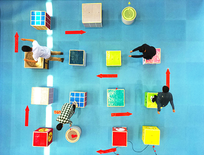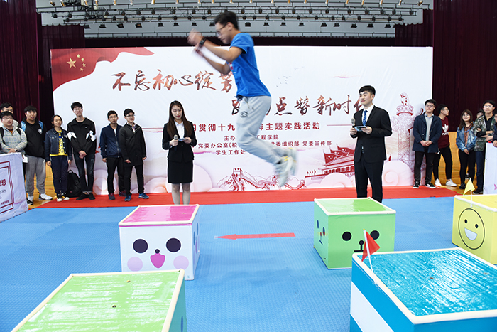 说起这个将小游戏元素融入主题实践活动的创意,主创人员徐淳钰同学特别兴奋,“年初‘跳一跳’刚流行的时候,我看过团中央的一条微信,从‘跳一跳’中延伸到对人生哲理的解读,觉得特别有趣。开学以后就开始琢磨能不能把这个流行元素和主题学习活动结合起来。”“春暖花开,正是运动和学习的好时机。我们不如把‘跳一跳’搬到体育馆来吧,配上有奖答题,游戏、运动、学习三不误。”徐淳钰的创意很快得到了分团委老师的支持。在老师的帮助下,徐淳钰、施皓、傅亚启几个同学忙乎开了,写策划、找道具、设计问题……。为了寓教于乐,引导同学们感悟十九大、思考新时代新青年的责任与担当,大家在设计问题时动足了脑筋。据介绍,活动共设计了四轮题目,分别是诗词浅赏、党团小知识、成语竞猜和“厉害了我的国”即兴演说。“玩过手机‘跳一跳’的都知道,游戏小人在一些特殊的小盒子上停一停是可以加分的,在我们现场版的小盒子上停一停、答对了问题同样也可以加分,寓意着新时代的大学生,不能两耳不闻窗外事,还要坚定信念、培养品格、开阔视野,这些都是青春的加分项。”电力工程学院分团委书记的解释,说出了活动策划者的良苦用心。