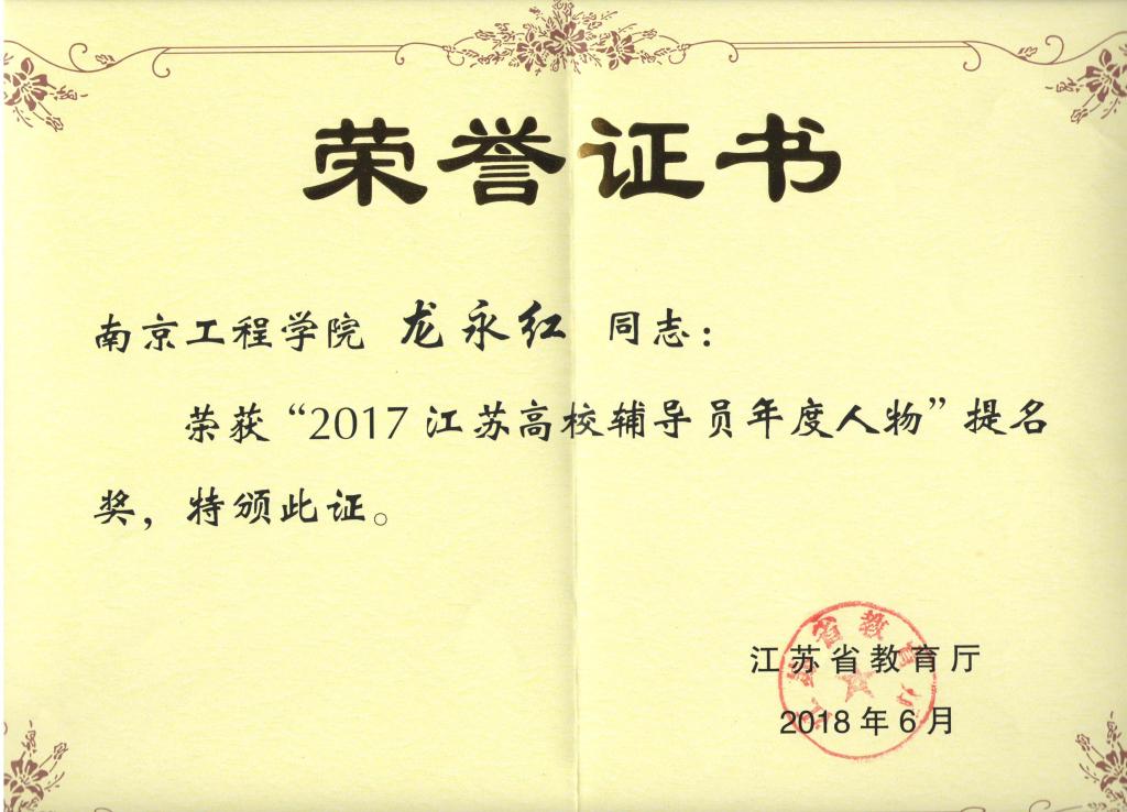 此次评选于今年3月启动,全省122所院校122位辅导员、127所院校221位大学生参加了本次评选。经过两轮专家评审、风采展评、网络推选、实地考察等环节,共评选出“2017江苏高校辅导员年度人物”10名、提名奖20名,“2017江苏省大学生年度人物”10名、提名奖23名,龙永红老师获得“2017江苏高校辅导员年度人物”提名奖,这是永利官网首次获得此项荣誉;严正同学获得“2017江苏省大学生年度人物”提名奖,这是永利官网第2次获得此项荣誉。