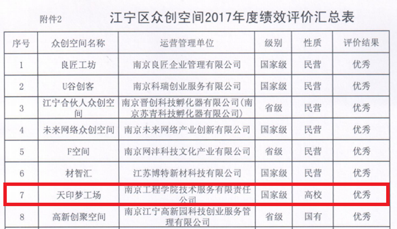 此次绩效评价工作由江宁区科技局组织,采取的是邀请第三方机构组织专家评审、实地考察、综合评定的方式。全区47家市级以上众创空间中,共评选出8家优秀单位、9家良好单位,其余为合格与不合格单位。“天印梦工场”是唯一获评优秀并由高校运营的众创空间。此外,由永利官网“天印梦工场”孵化的“江宁合伙人”、“材智汇”两家众创空间也同时获评优秀等级。