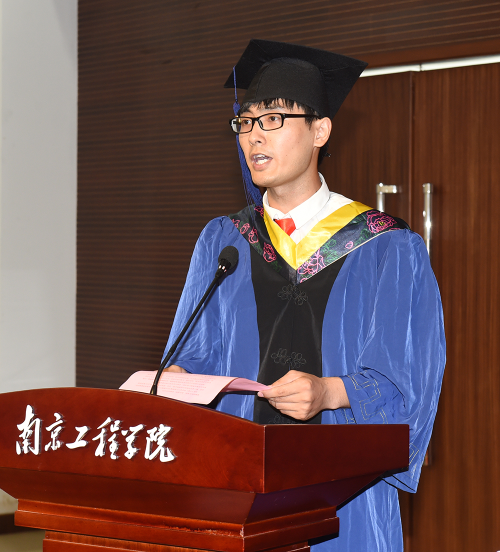 毕业生代表王东杰同学代表2018届全体研究生感谢母校的悉心培育、导师们的悉心教导。他说,涉世或始于今日,立生却在生平。母校注入的心血与呵护,导师镌刻下认真做事、正直做人的人生态度,最终都将以知识之香气、品格之傲气、立于社会之底气氤氲在2018届全体研究生周围。永怀春风教,难忘化雨恩。他祝福母校蓬勃发展,再书华章;祝福导师桃李天下,幸福安康。