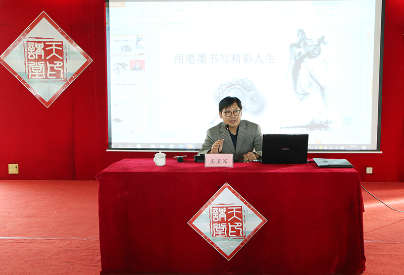 讲座中,王卫军先生从《习近平给中央美术学院老教授的回信》说起,阐述了美育和书法的特殊关系,中国书法历史文化悠久,书法在我国已不仅仅是提笔写字,而是一门艺术,一种学问。书法创作不仅可以锻炼毅力品格,还可以陶冶情操,丰富生活;书法既传递传统文化精神,亦对提高审美能力具有独特的价值。他指出,中国书法是中华民族文化遗产中的瑰宝,在中国历史上涌现出许多优秀的书法家,流传下来许多精美之作,他以诸多著名书法家的作品为例,对书法的五大类进行了详细介绍,同时结合自己从事书法工作多年的切身体验,指出书法所蕴含的时代精神风貌,并诠释了学习书法的好处。在怎样学习书法的问题上,他耐心地讲解了“临帖”的方法及注意事项。他还以各种著名碑帖为例,指导在场师生在今后的生活中应当如何品鉴和欣赏美,并希望同学们进一步提高审美能力,书写精彩人生。