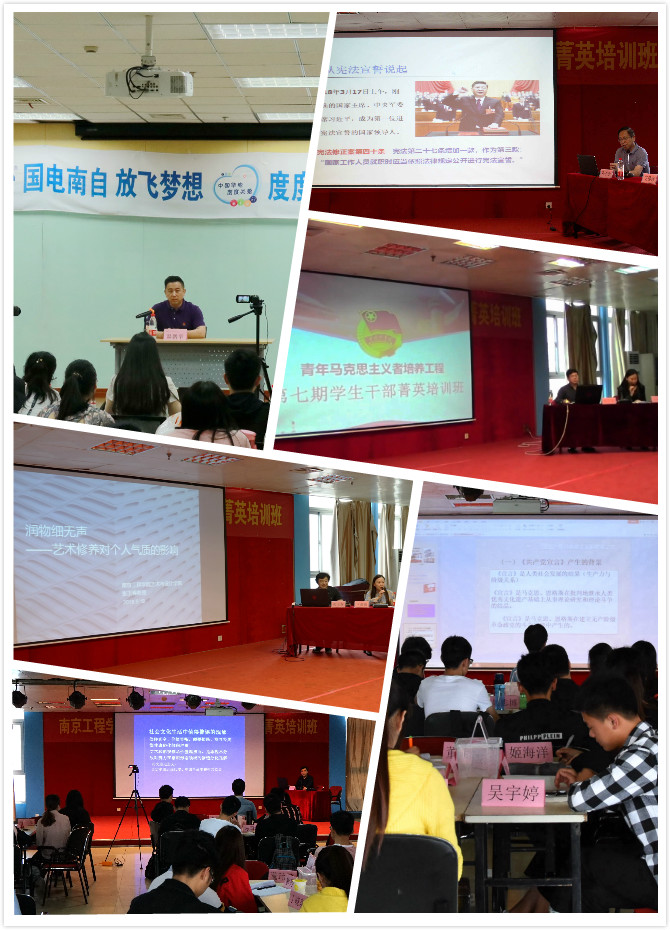 此外,校团委还邀请了南京财经大学马克思学院党委书记耿步健教授带领学员深入学习贯彻党的十九大精神和习近平新时代中国特色社会主义思想,阐述新时代青年的使命与担当。江宁区委党校张洪新副校长为学员作了题为“学习宪法 弘扬宪法精神”的专题报告;江苏省委党校党史党建部副主任周延胜教授为学员介绍了中国共产党的创业史、奋斗史、改革开放史,解读中国共产党奋斗历程的基本启示。艺术与设计学院院长张玉春教授以“润物细无声——艺术作品对个人气质的影响”为主题,激励学员从艺术中收获新的感悟和启迪。马克思主义学院王孝勇教授作了《共产党宣言》经典导读,阐述了《共产党宣言》和马克思主义之间的关系,启示同学们深入了解《共产党宣言》与中华民族百年命运的紧密联系。除了专题讲座以外,团委还组织学员深入国电南京自动化股份有限公司参观学习,强化实践认知。国电南京自动化股份有限公司团委书记温鹏举为学员作了“如何打造新时代一流高素质人才”专题报告,激发学员用创新思维的方法将理论与实际相结合,锻炼提高自己情商,开拓思维的能力。