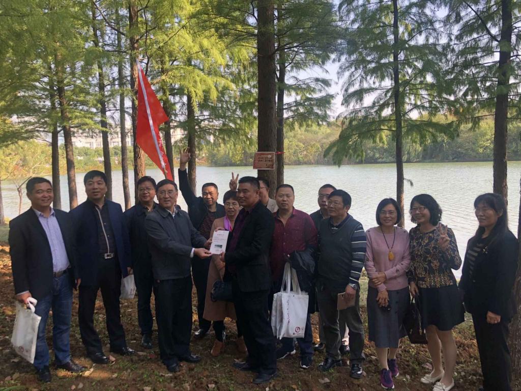 电力工程学院、人文与社会科学学院、计算机工程学院等学院的老师和校友们来到天印湖畔的校友林,校友们一起将专属名牌挂到认养的校友树上,并在树下合影留念。