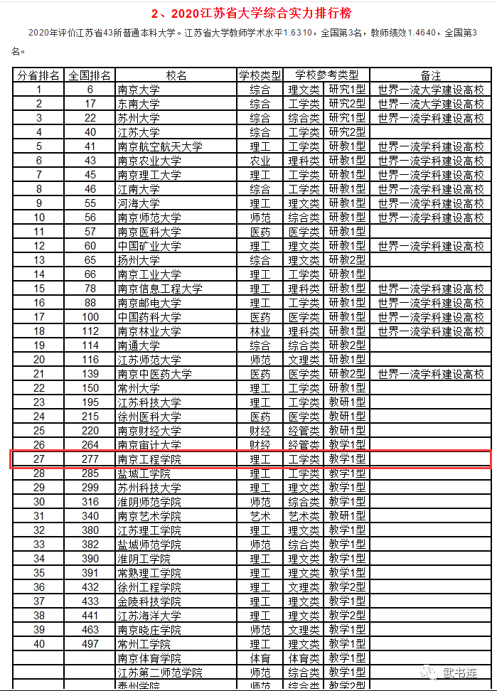 永利官网在武书连2020江苏省大学综合实力排名中位居27位