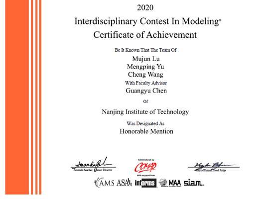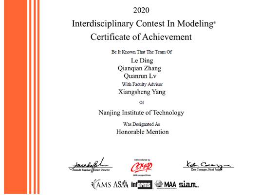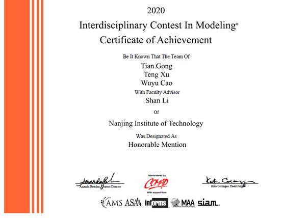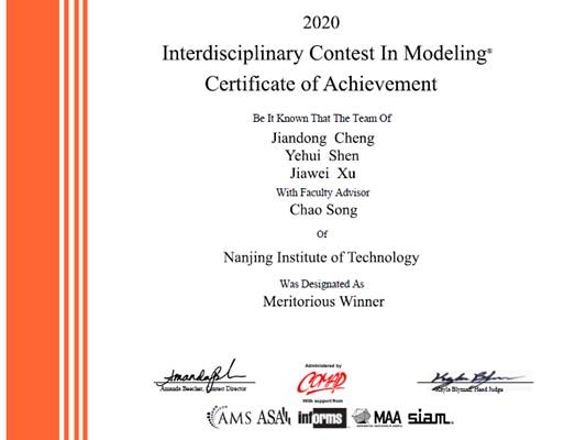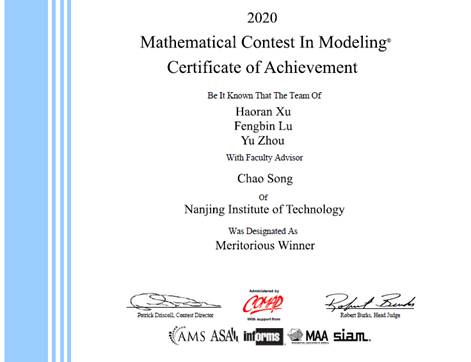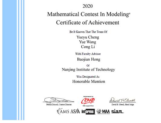 日前,2020年美国大学生数学建模竞赛和交叉学科建模竞赛(MCM/ICM)成绩揭晓。永利官网共获得Meritorious Winner(国际一等奖)2项,Honorable Mention(国际二等奖)5项,其余参赛队伍获得Successful Participant(成功参赛奖)9项。