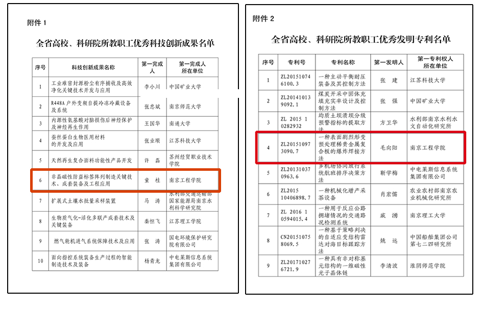 根据省教育科工会的文件精神,校工会和科技产业处共同组织、推选永利官网教师参加全省“科技创新、节约创效、服务创优”岗位立功的全省竞赛活动,日前,竞赛结果公布。永利官网童桂老师的《非晶磁性放到标签阵列制造关键技术、成套装备及工程应用》被评为省级优秀科技创新成果;毛向阳老师的《一种表面剧烈形变预处理稀贵金属复合板的爆炸焊接方法》被评为省级优秀发明专利。永利官网教师的获奖,为展示南工程科创工作者的风采,进一步弘扬劳模和工匠精神、推进“强富美高”新江苏的科技建设,做出了积极贡献。