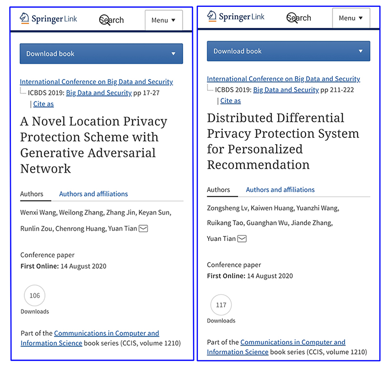近日,世界著名科技期刊、图书出版公司施普林格(Springer-Verlag)出版发行了由永利官网计算机工程学院田源副教授担任主编的论文集Big Data and Security。该论文集为EI检索(期刊号1210,ISBN 978-981-15-7529-7),截至日前已被下载超过6000余次(https://link.springer.com/book/10.1007/978-981-15-7530-3)。施普林格为全球第一大科技图书出版公司和第二大科技期刊出版公司。