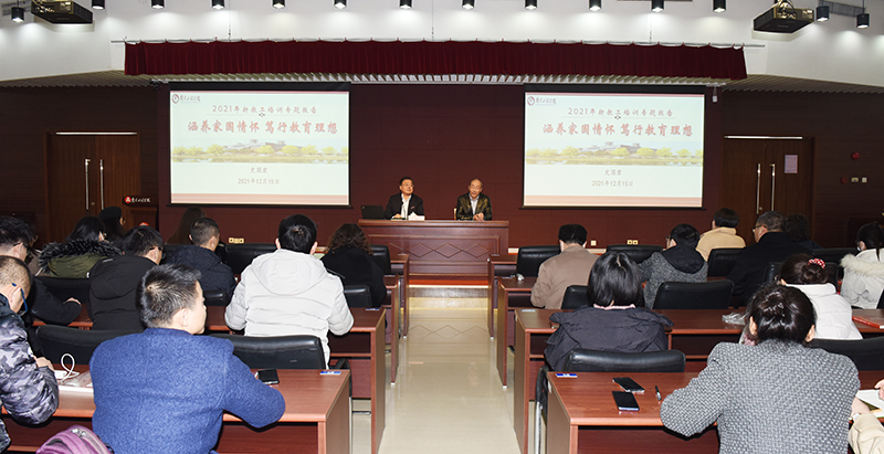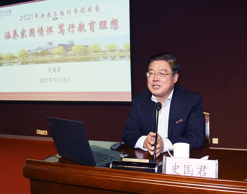 12月15日下午,党委书记史国君来到永利官网2021年度新教工入校教育培训班现场,以“涵养家国情怀 笃行教育理想”为主题,为70余名新进教职工上了一堂别开生面的职业教育课。