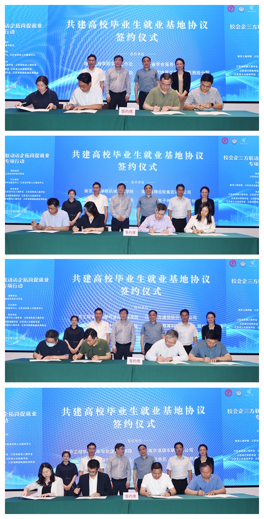 活动中,学生工作处、机械工程学院、电力工程学院、信息与通信工程学院、计算机工程学院、建筑工程学院、汽车与轨道交通学院、工业中心负责人分别与江苏省学会服务中心、南京高精齿轮集团有限公司、常州是为电子有限公司南京分公司、江苏十方通信股份有限公司、国信蓝桥教育科技(杭州)股份有限公司、中车南京浦镇车辆有限公司、江苏南京地质工程勘察院、南京汽轮电机(集团)有限责任公司签订共建毕业生就业基地协议。