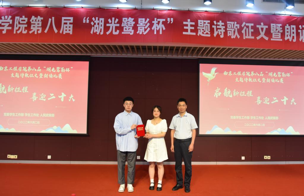 据介绍,自4月27日发布活动通知以来,学生工作处精心组织,各学院(中心)积极发动和推荐,共收到征文及朗诵作品百余件。经专家评审,汽车与轨道交通学院交控202班吴浩同学作品《清平乐·春宁》在第八届“湖光鹭影杯”主题诗歌征文比赛中荣获一等奖,主题诗歌征文还产生二等奖3名、三等奖6名、优胜奖10名。