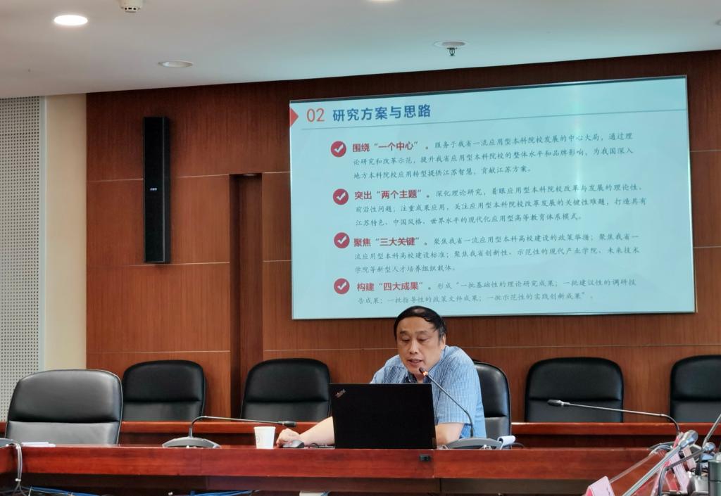 会上,史金飞院长就重大委托专项课题“江苏省一流应用型本科院校建设战略重点与实施策略研究”完成情况作了专题汇报。课题自立项以来,在省教育厅高教处的领导和省高教学会的指导下,根据省教育厅“调查研究、撰写报告、转化政策、学术要求”的研究要求,坚持“理论指导实践,实践创新理论”的研究思路,科学制定研究方案,明确任务分工,由江苏省应用型本科院校研究会理事长史金飞教授、监事长陈小虎教授共同担任课题负责人,永利官网联合金陵科技学院、常熟理工学院、三江学院、南大金陵学院等会员高校组成课题研究组,具体由金陵科技学院、常熟理工学院和永利官网分别牵头三个专项子课题研究。课题组坚持服务我省一流应用型本科院校发展大局,围绕国内外应用型高校建设的热点难点,结合我省应用型本科院校发展需求,既注重应用型本科院校建设的理论探索,又重视实践调查,聚焦我省一流应用型本科院校建设的政策举措、建设标准和示范性产业学院建设等,突出成果的学术性和政策性,形成多篇高水平理论研究论文,4份高水平调研报告,其中转化成全省性正式政策3份,召开10多次国内外高水平学术会议,有力推动了我省一流应用型大学建设,提升了我省应用型高校影响力。