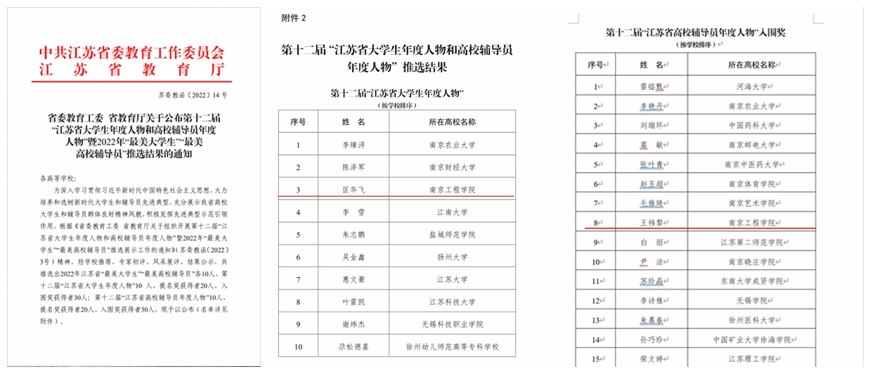 近日,省委教育工委、省教育厅公布第十二届“江苏省大学生年度人物和高校辅导员年度人物”暨2022年“最美大学生”“最美高校辅导员”推选结果,永利官网电力工程学院电力185班的匡华飞同学荣获第十二届“江苏省大学生年度人物”,这是永利官网学子参评该奖项以来获得的最好成绩。自动化学院王祎黎老师获第十二届“江苏省高校辅导员年度人物”入围奖。