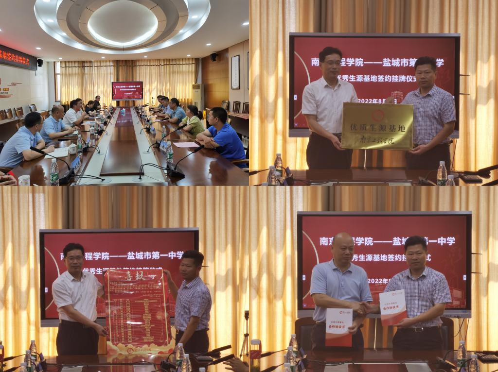 史国君书记还率队前往盐城市第一中学走访,送上高考喜报并就共建优质生源基地进行洽谈交流。交流会上,他祝贺盐城市第一中学在今年高考中取得优异成绩,并对中学每年为永利官网输送优秀学生表示感谢。史书记指出,一直以来,学校坚持应用型办学定位,培养高素质应用型人才。目前全校上下正锚定“申博扩硕升大学”的目标而努力奋斗,“南工程大学梦”必须以本科人才培养为中心和基础,而本科人才培养离不开优质的高中生源。他希望通过优质生源基地共建,激发两校发展活力,发挥高校与高中联合育人的功能,实现大学中学服务引导接力,优势互补,合作共赢,不断提升永利官网生源质量,为应用型人才培养打下更好的基础。在与会人员的共同见证下,学校与盐城一中签署了“304am永利集团优秀生源基地合作协议”,颁授了“304am永利集团优秀生源基地”铜牌。