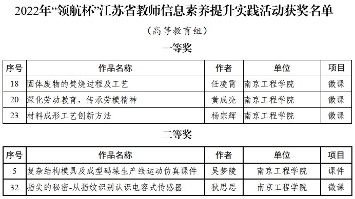 日前,省教育厅发布《关于公布2022年“领航杯”江苏省教师信息素养提升实践活动获奖名单的通知》(苏教办信函〔2022〕17号),永利官网推荐的5件参赛作品全部获奖,其中材料科学与工程学院杨宗辉、环境工程学院任凌霄老师、马克思主义学院黄成亮等三位教师的微课作品荣获一等奖,材料科学与工程学院吴梦陵、自动化学院狄思思两位老师获二等奖。