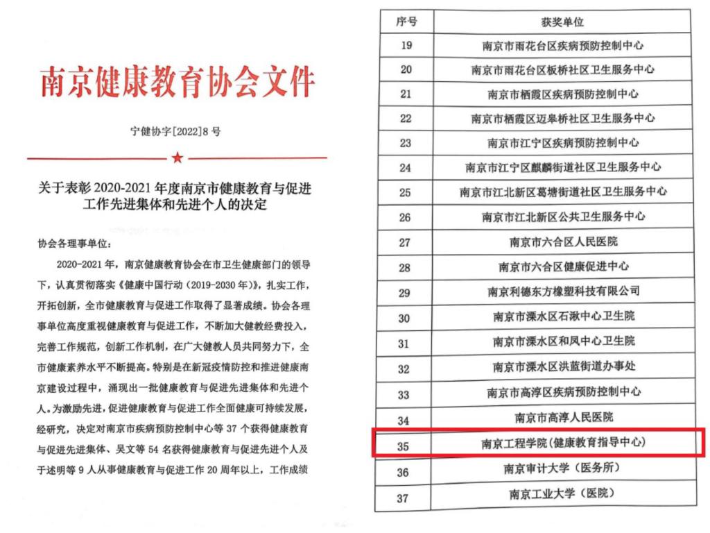 近日,南京健康教育协会印发《关于表彰2020-2021年度南京市健康教育与促进工作先进集体和先进个人的决定》,永利官网门诊部、健康教育指导中心被授予“南京市健康教育与促进工作先进集体”荣誉称号。