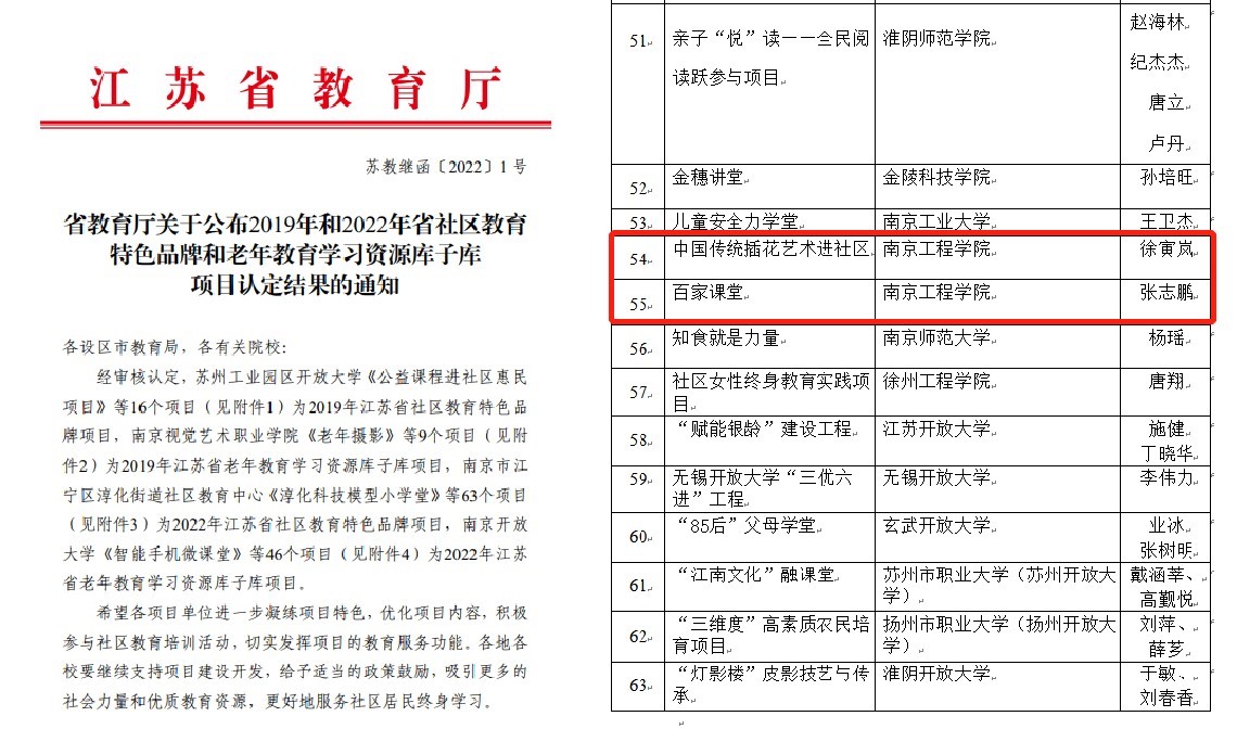 近日,江苏省教育厅发布《2019年和2022年省社区教育特色品牌和老年教育学习资源库子库项目认定结果的通知》(苏教继函〔2022〕1号),永利官网《中国传统插花艺术进社区》和《百家课堂》两个项目经组织申报、评审、公示等环节,成功入选2022年江苏省社区教育特色品牌项目。