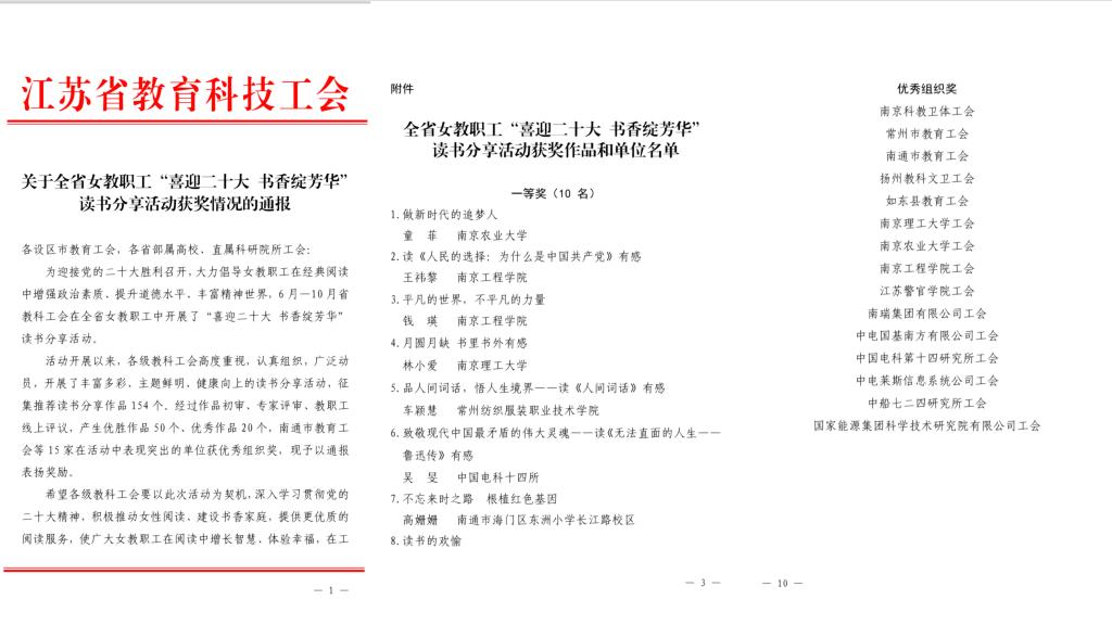 近日,江苏省教育科技工会发布《关于全省女教职工“喜迎二十大 书香绽芳华”读书分享活动获奖情况的通报》,永利官网选送的自动化学院王祎黎老师《读<人民的选择:为什么是中国共产党>有感》和计算机工程学院钱瑛老师《书香绽芳华,在平凡中汲取力量》两部作品在全省154篇读书分享作品中脱颖而出,均获得一等奖的好成绩。永利官网荣获优秀组织奖。