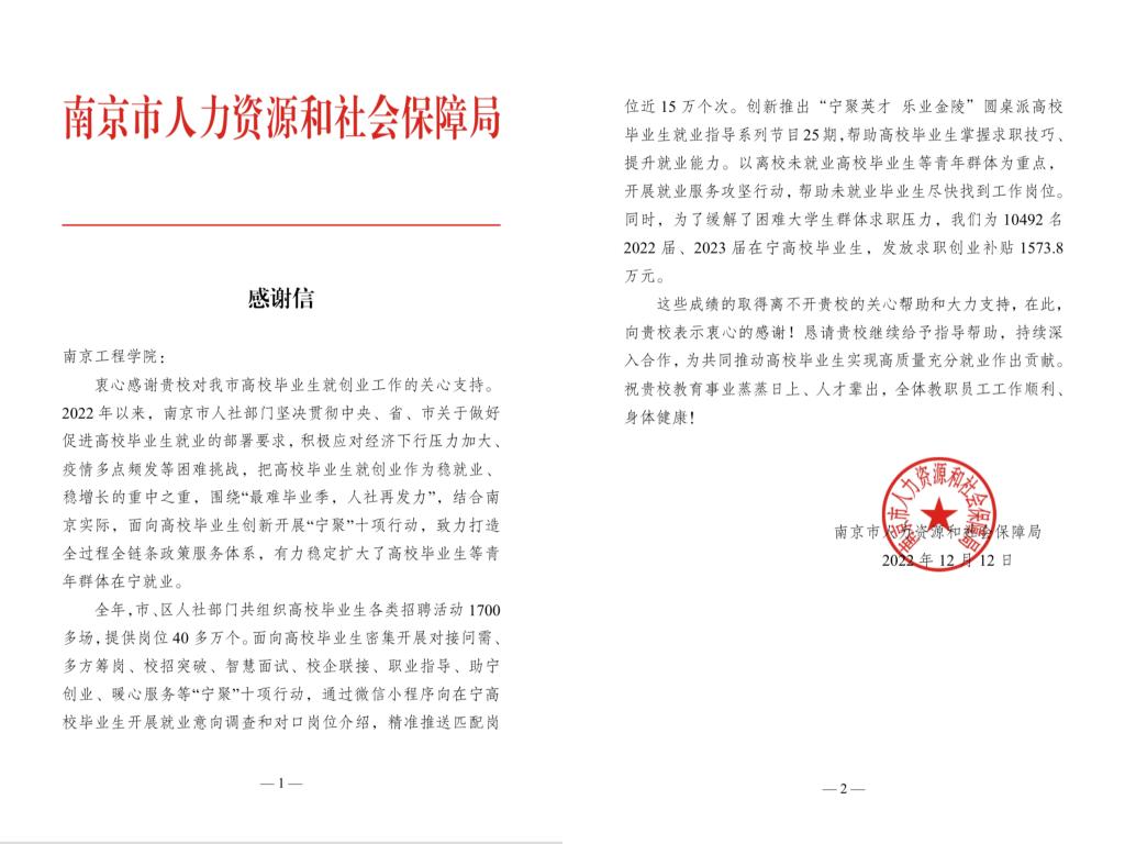 近日,永利官网收到南京市人力资源和社会保障局感谢信,对学校加强与南京市校地合作、拓宽就业引才渠道工作予以充分肯定,赞扬了学校积极推动高校毕业生实现高质量充分就业而作出的突出贡献,表达了对学校就业育人工作的衷心感谢。