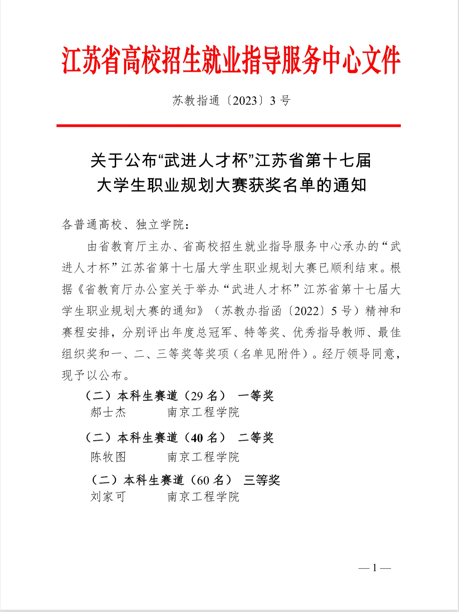 近日,“武进人才杯”江苏省第十七届大学生职业规划大赛总决赛获奖结果公布,永利官网推荐参加省赛的三名选手全部榜上有名,材料科学与工程学院郝士杰,信息与通信工程学院陈牧图、计算机工程学院刘家可三位同学分别荣获本科生赛道一、二、三等奖。