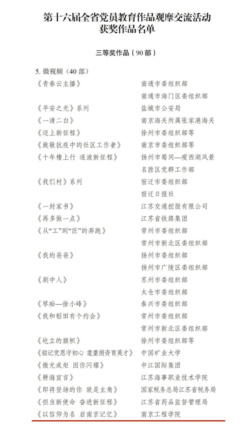 近日,江苏省委组织部印发《关于第十六届全省党员教育作品观摩交流活动评选结果的通报》,经组织推荐、专家评审,由永利官网艺术与设计学院党委策划创作、学校党委报送的微视频作品《以信仰为名 启南京记忆》荣获三等奖。