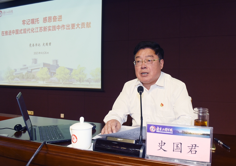 4月26日下午,校党委书记史国君以“牢记嘱托 感恩奋进 在推进中国式现代化江苏新实践中作出更大贡献”为题,在至勤楼·行政中心多功能厅为党员干部讲授学习贯彻习近平新时代中国特色社会主义思想主题教育专题党课,引导广大师生党员在“学”上下功夫、在“思”上求深度、在“践”上见成效、在“行”上显担当。