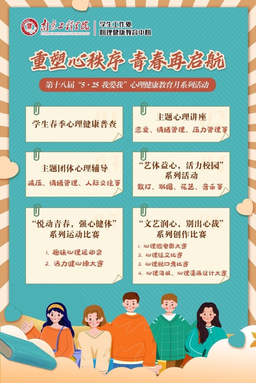 据介绍,自3月起,学校以“3·20咱爱您”学生社区心理文化节、“5·25我爱我”心理健康教育月为契机,在全校范围内开展“重塑心秩序 青春再启航”心理健康教育主题活动。本届心理健康教育活动月设有六大板块,将相继开展专题心理讲座、团体心理辅导、“艺体益心”活动、活力健心操大赛、“重塑身心秩序”运动打卡等10项校级活动以及风筝节、音乐瑜伽、草地音乐节等38项院级特色活动。