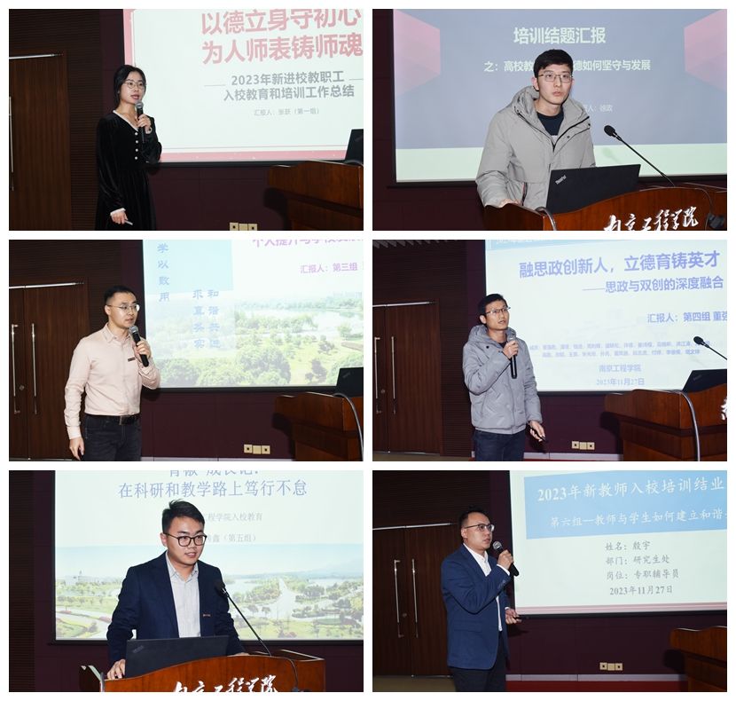 结业仪式上,新教工结合培训内容,根据分组围绕个人提升与学校发展、教学与科研、教师与学生和谐关系、教师职业道德、课程思政建设等方面分享了学习收获。