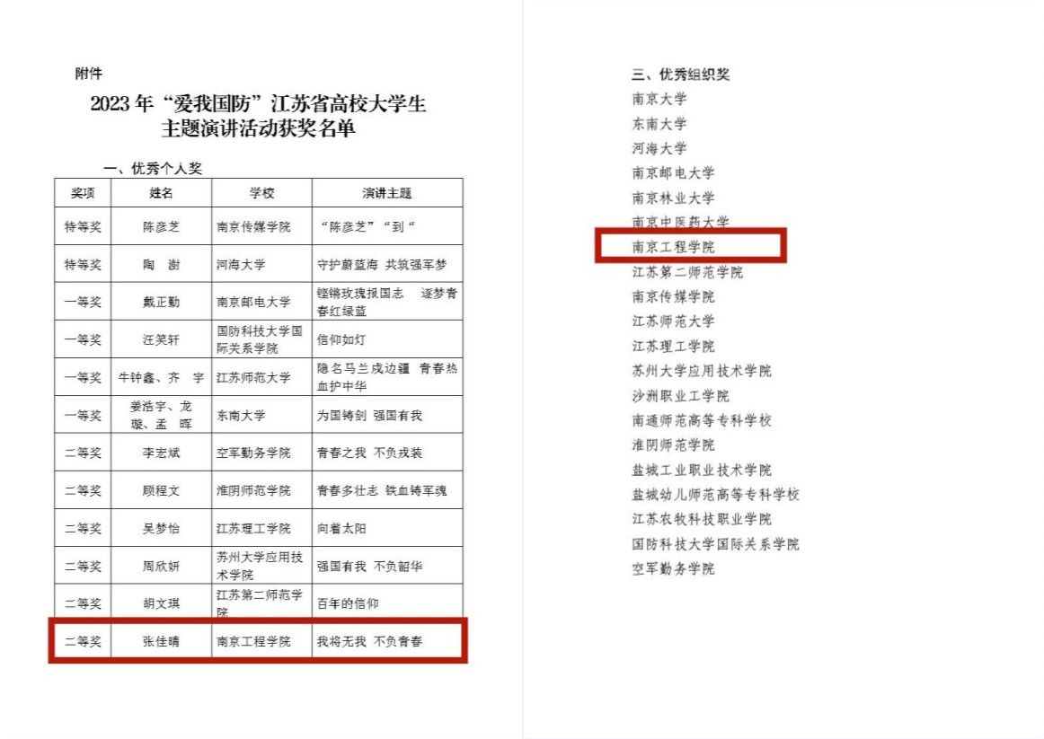 近日,2023年“爱我国防”江苏省高校大学生主题演讲活动在南京落下帷幕,永利官网电力工程学院2021级本科生张佳晴荣获优秀个人奖二等奖,学校获优秀组织奖。