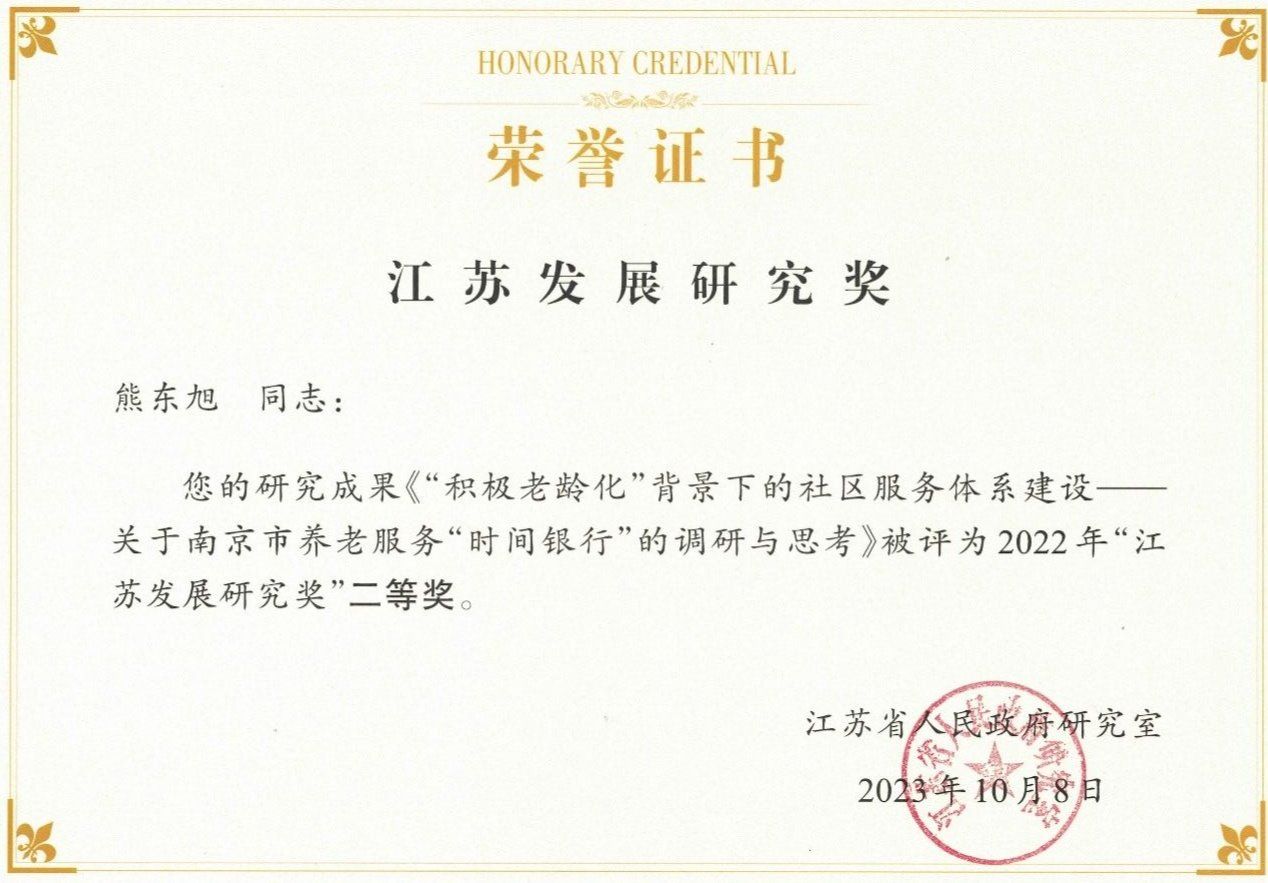 近日,江苏省人民政府研究室公布2022年“江苏发展研究奖”获奖名单,永利官网建筑工程学院熊东旭副教授的研究成果《“积极老龄化”背景下的社区服务体系建设——关于南京市养老服务“时间银行”的调研与思考》从447项申报成果中脱颖而出,荣获二等奖。