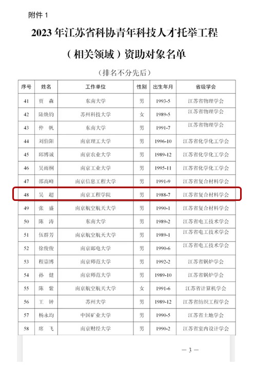 近日,江苏省科学技术协会公布了2023年度“青年科技人才托举工程”入选名单,永利官网材料科学与工程学院青年教师吴超博士成功入选。