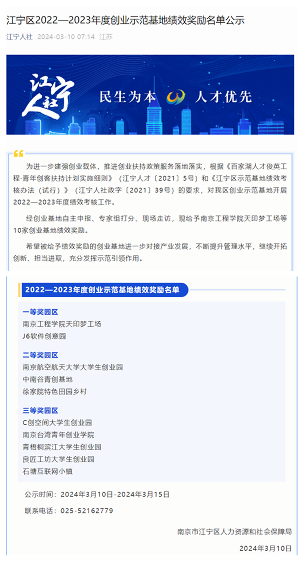 日前,江宁区人社局对2022-2023年度创业示范基地绩效奖励名单进行了公示,永利官网大学生创业园“天印梦工场”以第一排名荣获一等奖。
