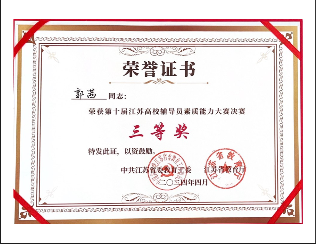 江苏高校辅导员素质能力大赛自2012年至今已举办十届,自2018年起,每2年举办一次,是江苏省辅导员职业领域最高层次和最高水平的比赛。大赛分初赛、复赛和决赛三个阶段,最终有40名辅导员成功晋级决赛。决赛分为基础知识测试、案例研讨、谈心谈话三个环节,郭茜老师在比赛中沉着应对、条分缕析、精准施策,展现了永利官网辅导员良好的精神风貌和扎实的工作能力。