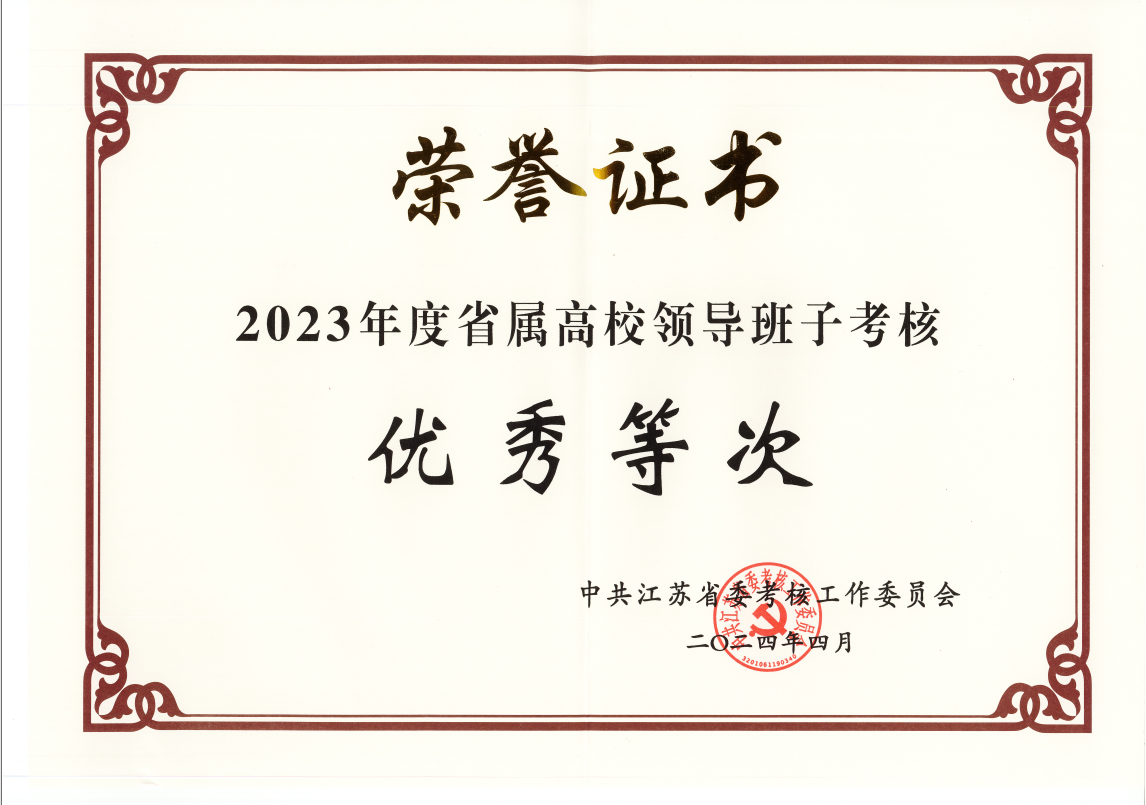 近日,中共江苏省委组织部公布2023年度地方普通高校领导班子考核结果,永利官网领导班子在考核中获评“优秀”等次。这是省委对学校领导班子团结奋进、担当实干的高度肯定和认可,也充分体现了校党委紧扣立德树人根本任务,以高质量党建引领事业高质量发展所取得的显著成效。
