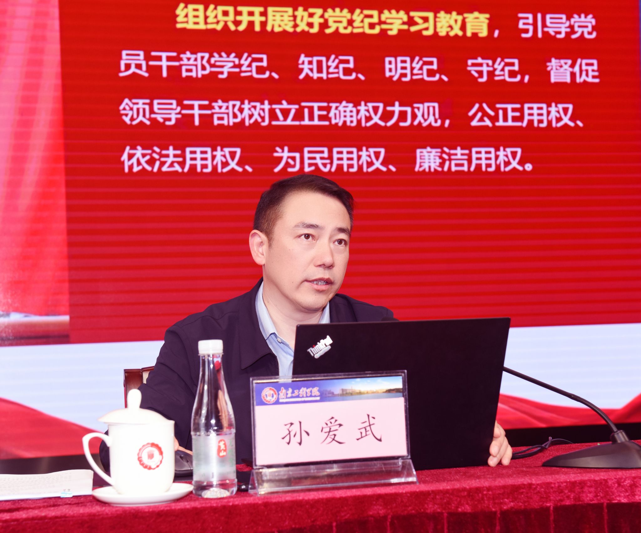孙爱武强调,在全党开展党纪学习教育,是以习近平同志为核心的党中央作出的重大决策部署,是加强党的纪律建设、推动全面从严治党向纵深发展的重要举措。各级党组织要担负起全面从严治党政治责任,认真开展党纪学习教育,精心组织实施,加强督促落实,营造学纪、知纪、明纪、守纪浓厚氛围。全体党员要以党纪学习教育为契机,坚定政治立场,提高思想站位,联系个人思想和工作实际、联系岗位职责、联系“十大一流工程”重点任务,把开展学习教育与落实第四次党代会精神结合起来,奋力谱写一流党建引领事业高质量发展新篇章,为把学校建成“国内领先、特色鲜明的一流应用型大学”、努力争当全国应用型高校“领头羊”“排头兵”不懈奋斗。