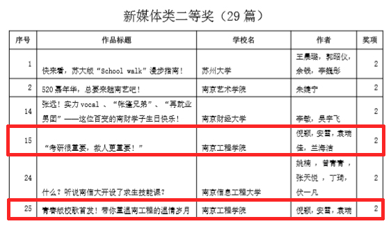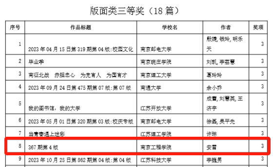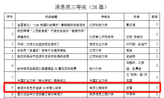 近日,江苏省高校融媒体研究会公布了2023年度江苏省高校校报获奖优秀作品,由永利官网党委宣传部报送的4件作品获奖。其中,《“考研很重要,救人更重要!”》《青春版校歌首发!带你重温南工程的温情岁月》获新媒体类二等奖;《离退休老党员连续19年爱心助学》获消息类三等奖;校报367期第4版获版面类三等奖。