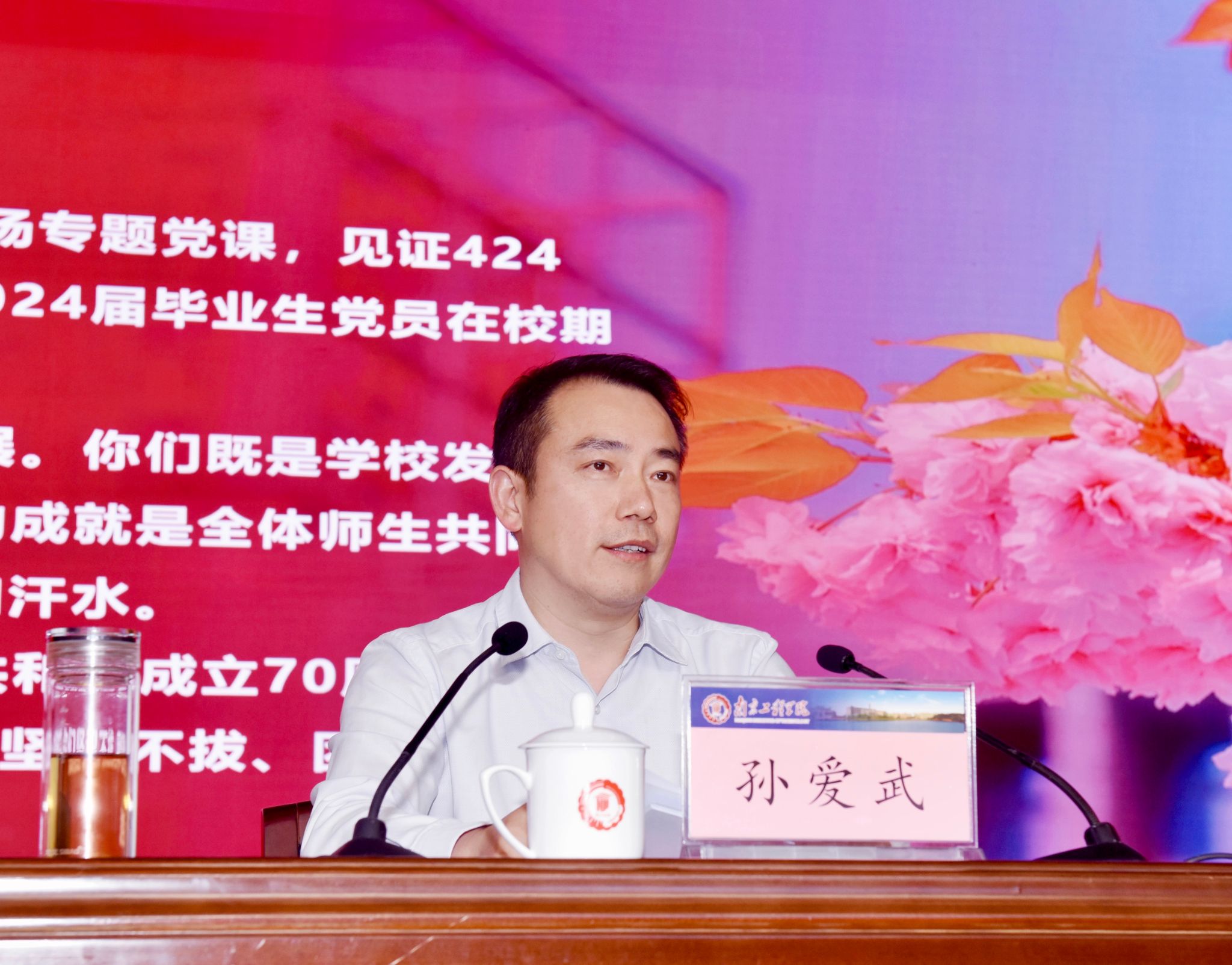 孙爱武以《牢记嘱托,积跬步以至星辰大海》为题,为全体发展对象培训班学员和毕业生党员上了一堂生动的专题党课。他介绍了一年来学校各项事业高质量发展取得的新成效,对大家作为学校发展的见证者、参与者和贡献者表达由衷感谢。他结合“新起点•奋楫扬帆”“凝聚力•接续奋斗”“新征程•牢记嘱托”三个篇章,勉励大家要牢固树立不负人民的家国情怀,坚定理想信念,牢记初心使命,把遵规守纪刻在心里。他希望,每一位同学牢记党员身份,以坚定的理想信念、坚强的责任担当,擦亮南工程人精神底色,展现应用型人才专业特色,积极投身到建设祖国、服务人民的事业中去,勇做新时代的追梦人和奋斗者,以实际行动向新中国成立75周年献礼。
