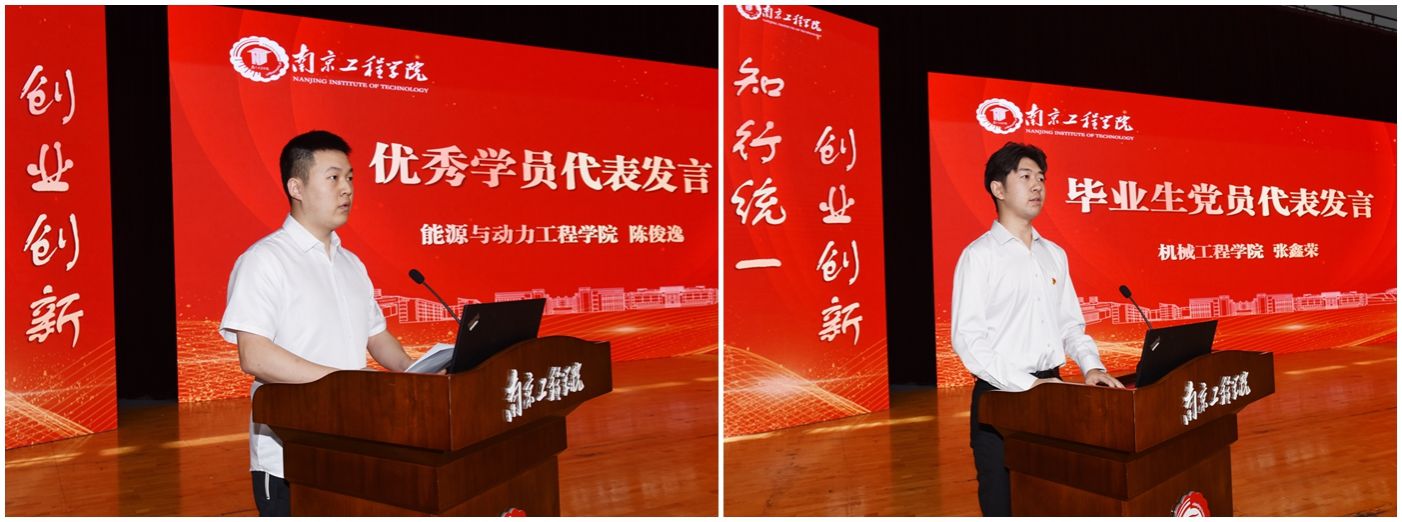 能源与动力工程学院能动212班陈俊逸、机械工程学院机械201班张鑫荣分别作为优秀学员代表与毕业生党员代表发言。他们表示将时刻以高标准严格要求自己,进一步强化纪律意识、加强自我约束,在今后的学习、工作中立大志、明大德、成大才、担大任,与时代同向同行、共同前进。