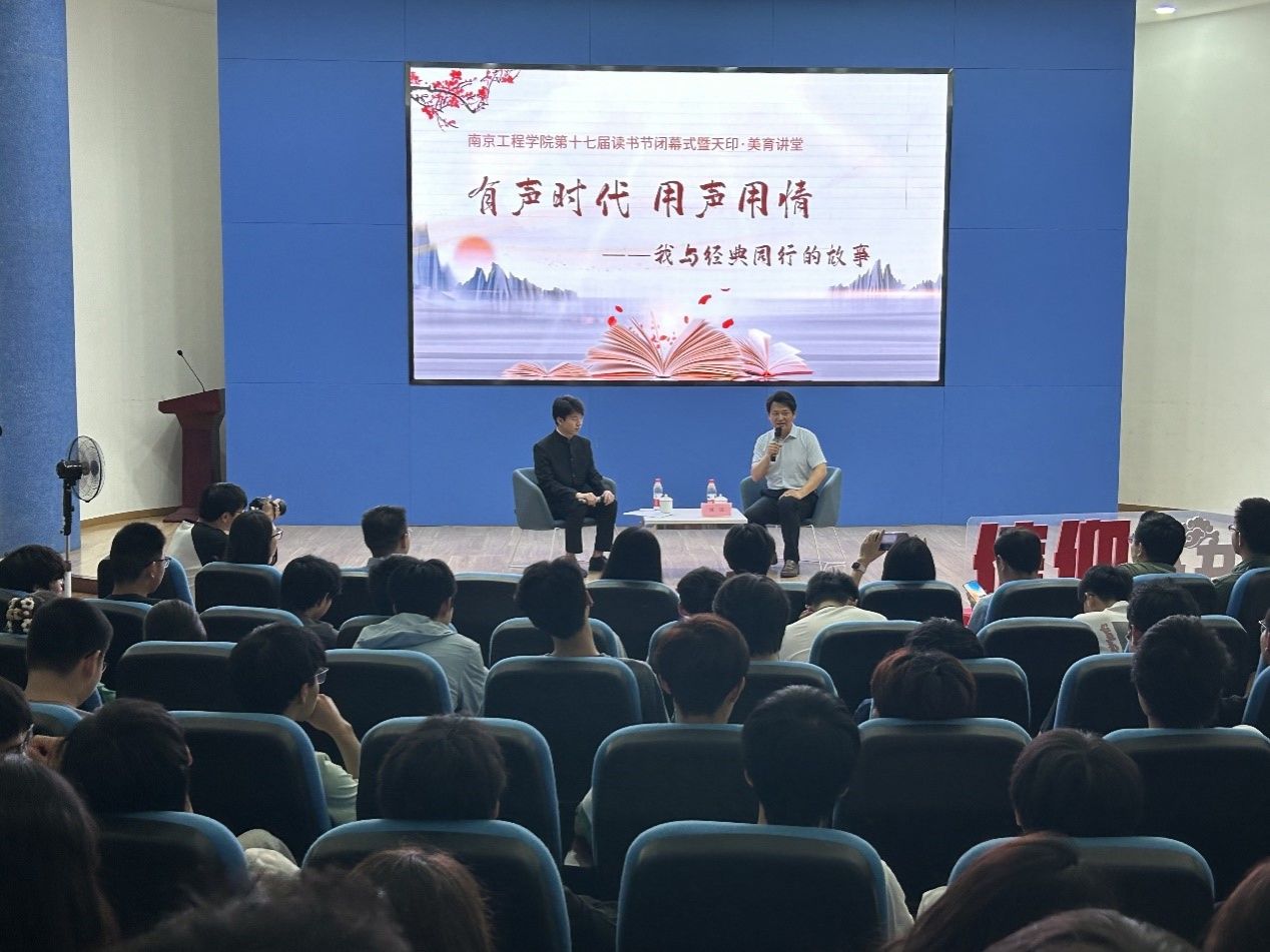 闭幕式特邀著名主持人、江苏省朗诵协会秘书长傅国老师带来题为“有声时代,用声用情——我与经典同行的故事”的讲座。傅老师结合个人成长经历,深情讲述了自己与经典书籍、诗词典籍的邂逅与感悟。他还饱含深情地朗诵了苏轼的《定风波》,将在场师生带入到那个风雨飘摇却又豪情万丈的时代。他勉励现场师生,保持内心的沉稳和坚定,笑对人生,踏实迈好每一步。