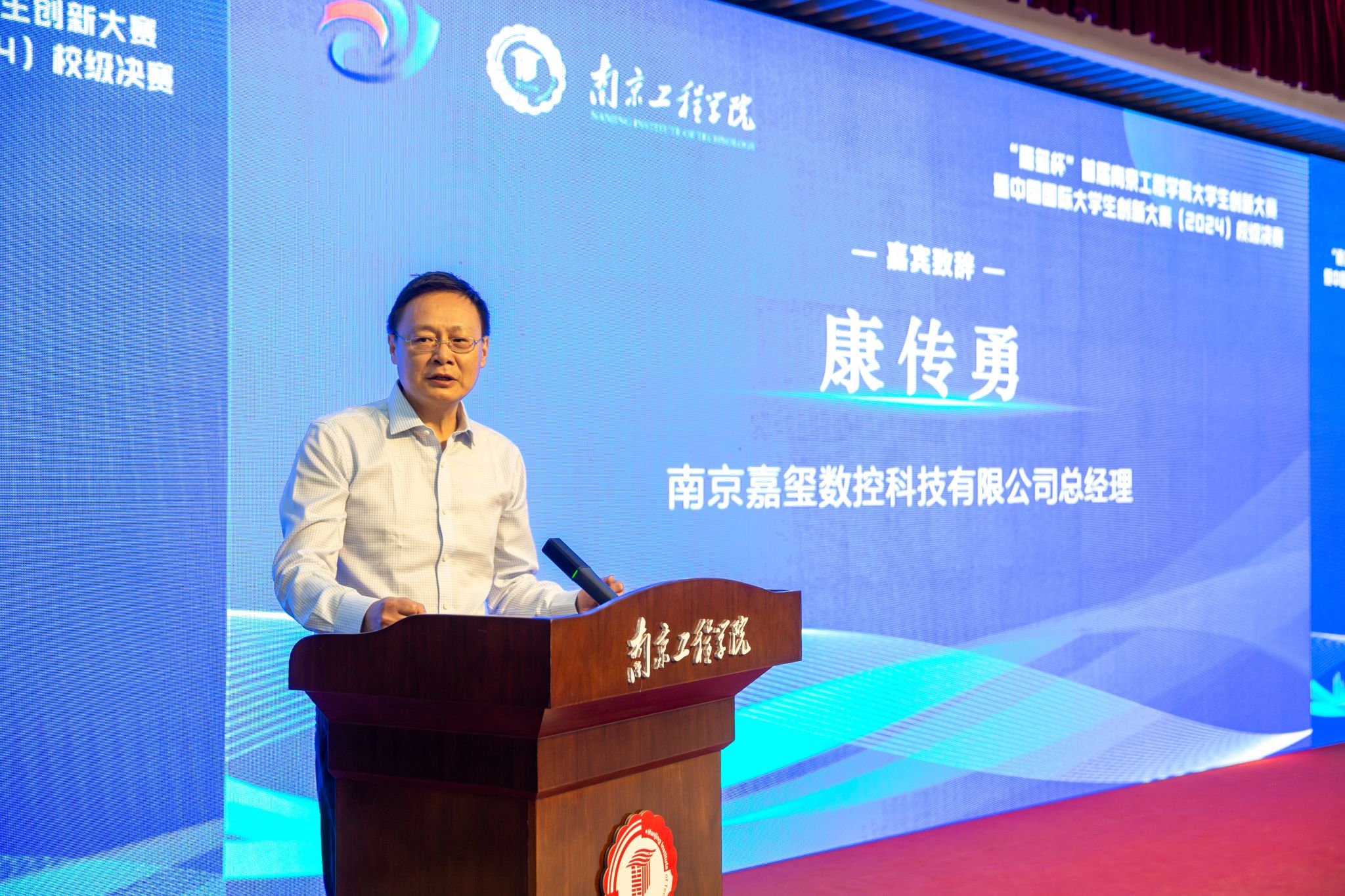为营造浓厚创新创业氛围,提升广大学子创新创业能力,6月16日上午,永利官网首届“嘉玺杯”大学生创新大赛暨中国国际大学生创新大赛校级决赛举办。本次大赛得到了校友企业南京嘉玺数控科技有限公司的大力支持,公司总经理康传勇和多位来自双创领域的嘉宾来到大赛现场。各二级学院双创工作负责人、相关工作人员、参赛项目团队成员及指导教师、师生代表等近200余人现场观摩比赛。党委常委、副校长朱松青出席活动并致辞。