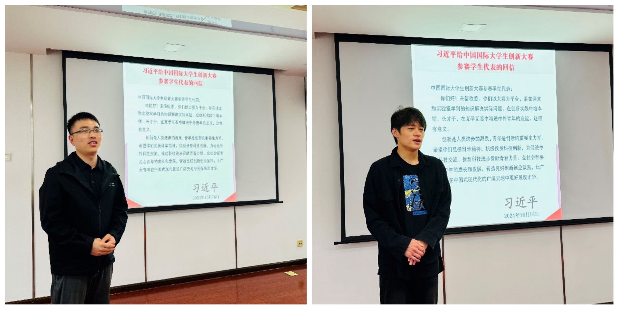 近日,中共中央总书记、国家主席、中央军委主席习近平给中国国际大学生创新大赛参赛学生代表回信,对他们予以亲切勉励并提出殷切希望。10月17日,学校组织教务处、创新创业学院全体工作人员和参赛学生代表等召开学习班,第一时间专题学习习近平总书记回信精神,热烈讨论分享心得体会。党委常委、副校长朱松青出席活动并讲话。