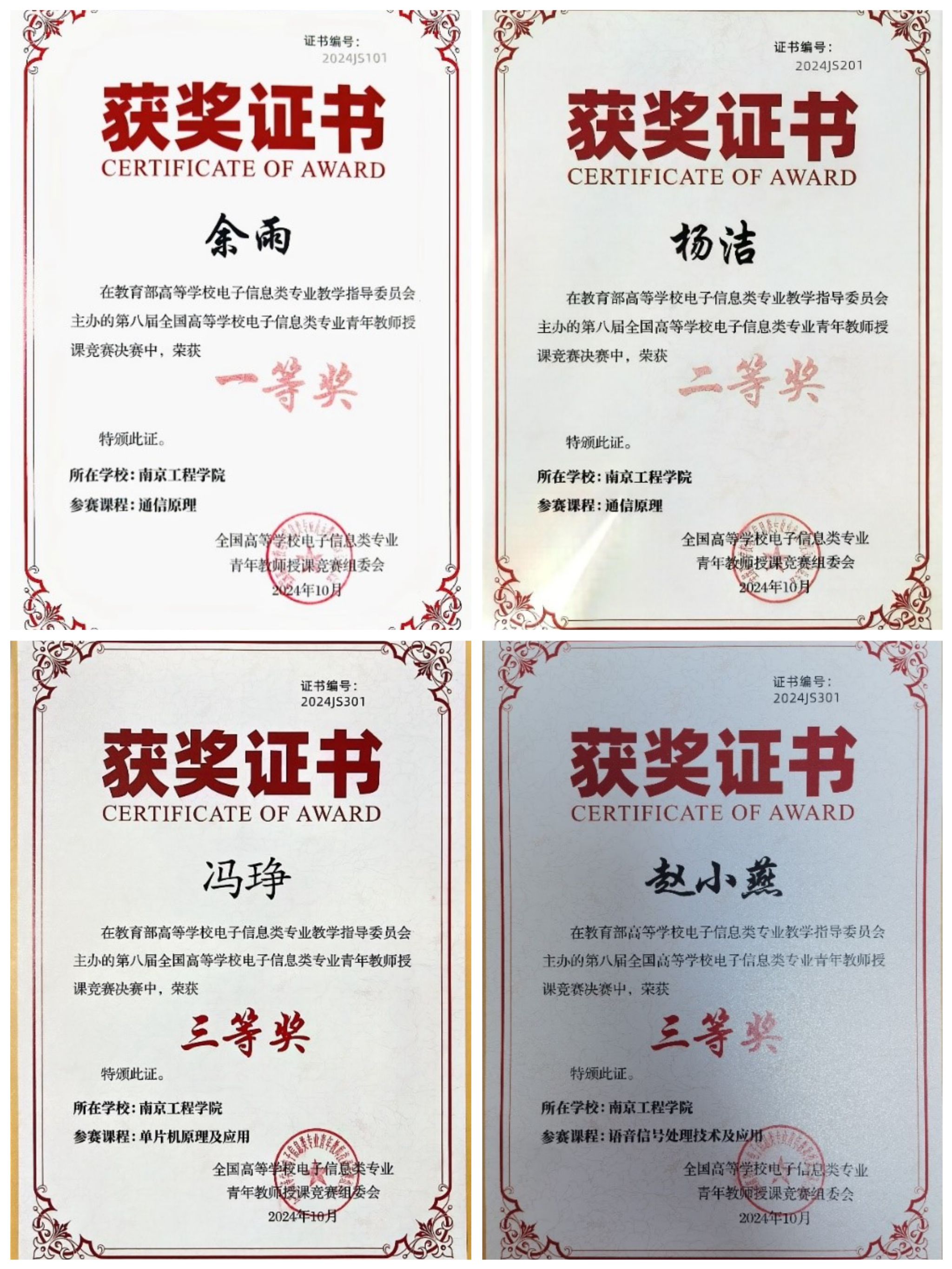 10月18日至20日,第八届全国高等学校电子信息类专业青年教师授课竞赛决赛在杭州举行。永利官网通信与人工智能学院、集成电路学院积极组队参赛,最终,余雨副教授荣获一等奖,杨洁教授获二等奖,冯琤副教授、赵小燕博士获三等奖,学校获“优秀组织奖”。
