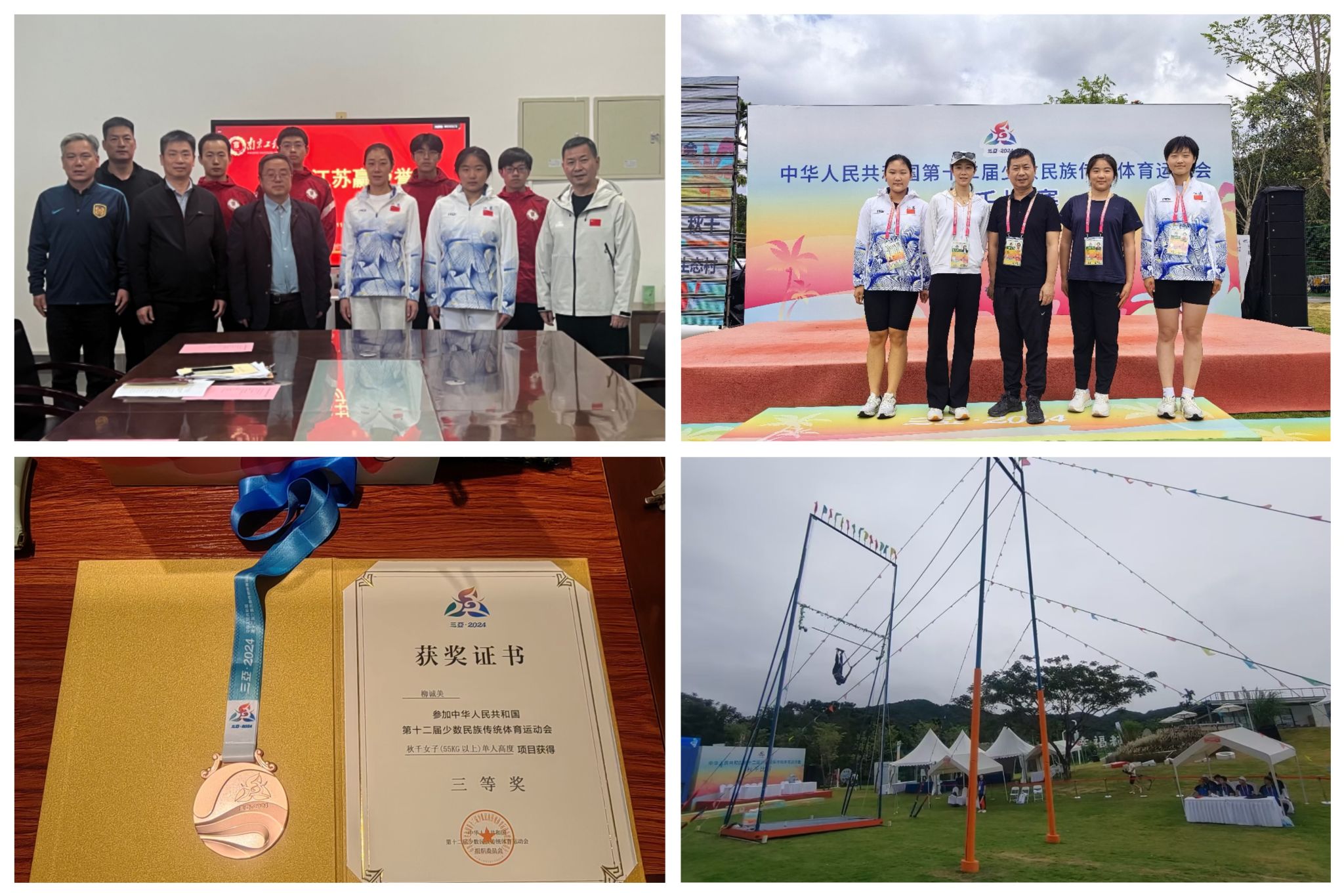 本届运动会由国家民族事务委员会和国家体育总局主办,规模宏大、竞争激烈。省少数民族传统体育项目基地作为江苏省唯一备战秋千项目训练基地,学校肩负重任,在领队教练员马文杰主任、黄昕老师带领下,紧紧围绕参赛任务,提前谋划、精心组织,狠抓训练,为成绩的取得奠定基础;同时作为永利官网同心教育实践基地建设的一部分,也是学校强化课程思政、深入推进体育育人的重要举措,得到学校党委统战部长期关心与指导。备赛以来,省民委领导多次关怀慰问,为队员们加油鼓劲;校领导关心关注,了解备赛进展,激励队员奋勇拼搏;党政办公室、党委统战部、党委宣传部、保卫处、教务处、学生工作处、研究生院、校医院、后勤保障处等相关部门通力合作,全力做好组织、宣传、服务等工作;队员们刻苦训练,表现精彩,为江苏代表团在民族运动会上赢得了荣誉、增添了光彩、贡献了力量。