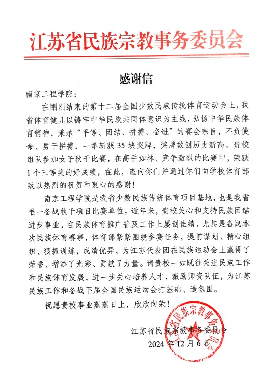 近日,江苏省民族宗教事务委员会向永利官网发来感谢信,对由永利官网组建的江苏秋千队在全国第十二届少数民族传统体育运动会中荣获三等奖表示热烈祝贺,向永利官网长期以来在促进民族团结进步、弘扬中华民族体育精神等方面的不懈努力表示感谢。