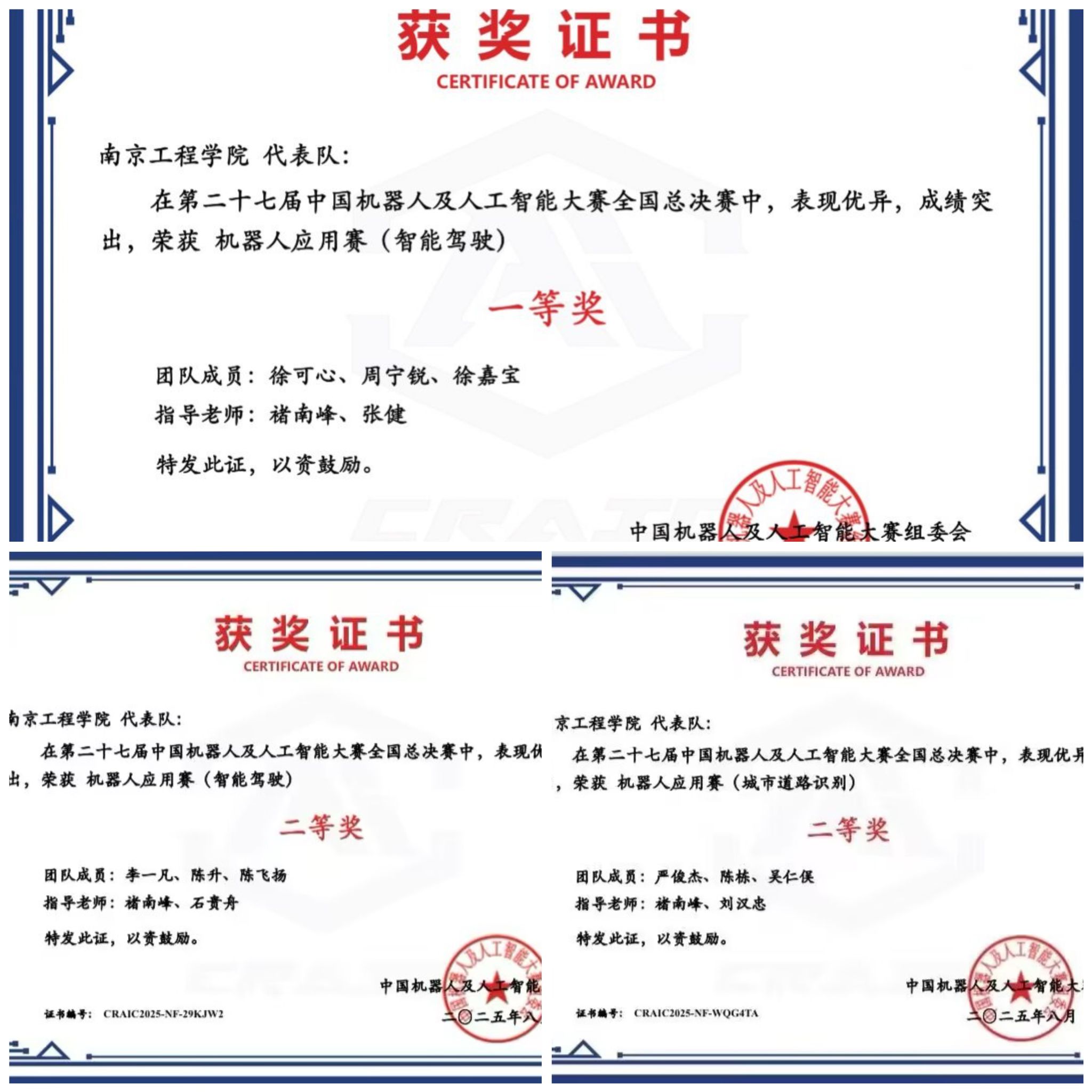 近日,2025年第二十七届中国机器人及人工智能大赛圆满落幕。由永利官网自动化学院、通信与人工智能学院、集成电路学院、工程训练中心、应用技术学院联合组成的参赛队伍取得好成绩:徐可心、周宁锐、徐嘉宝同学荣获全国一等奖;李一凡、陈升、陈飞扬同学团队和严俊杰、陈栋、吴仁俣同学团队分别荣获全国二等奖。